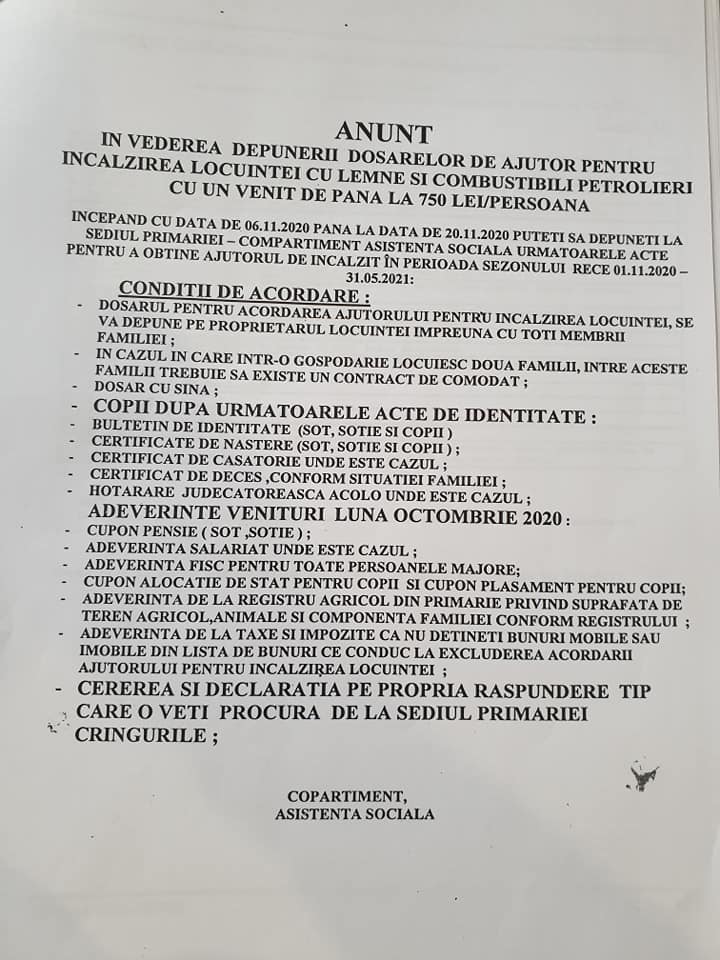 <p style="text-align: justify;"><strong>În perioada, 06.11.2020- 20.11.2020, se pot depune actele pentru obținerea ajutorului pentru încălzirea locuinței.</strong></p> <img class="aligncenter size-full wp-image-15086" src="https://dambovitanews.com/wp-content/uploads/2020/11/123767516_2439558693014668_6461702376314268573_n.jpg" alt="" width="720" height="960" /> <img class="aligncenter size-full wp-image-15087" src="https://dambovitanews.com/wp-content/uploads/2020/11/123534748_2439558796347991_6239487696746289493_n.jpg" alt="" width="720" height="960" />