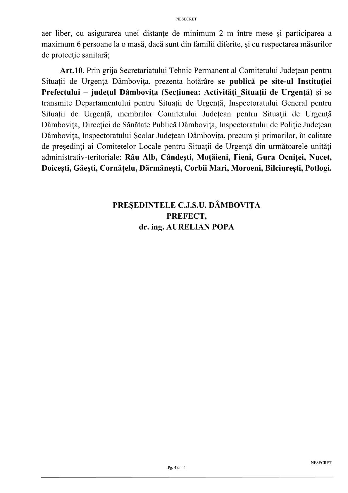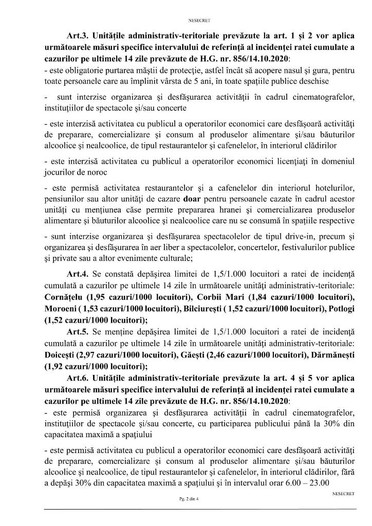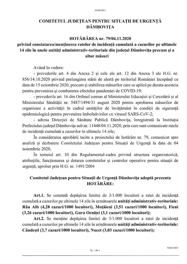 Comitetul Județean pentru Situații de Urgentă Dâmbovița tocmai a adoptat Hotărarea nr. 79/04.11.2020 prin care a constatat depăşirea limitei de 3/1.000 locuitori a ratei de incidenţă cumulată a cazurilor pe ultimele 14 zile în orasul Fieni (3,26 cazuri/1000 locuitori) și a stabilit aplicarea pe raza localității a unor măsuri specifice obligatorii pentru o perioadă de 14 zile (5-18 noiembrie 2020, inclusiv).