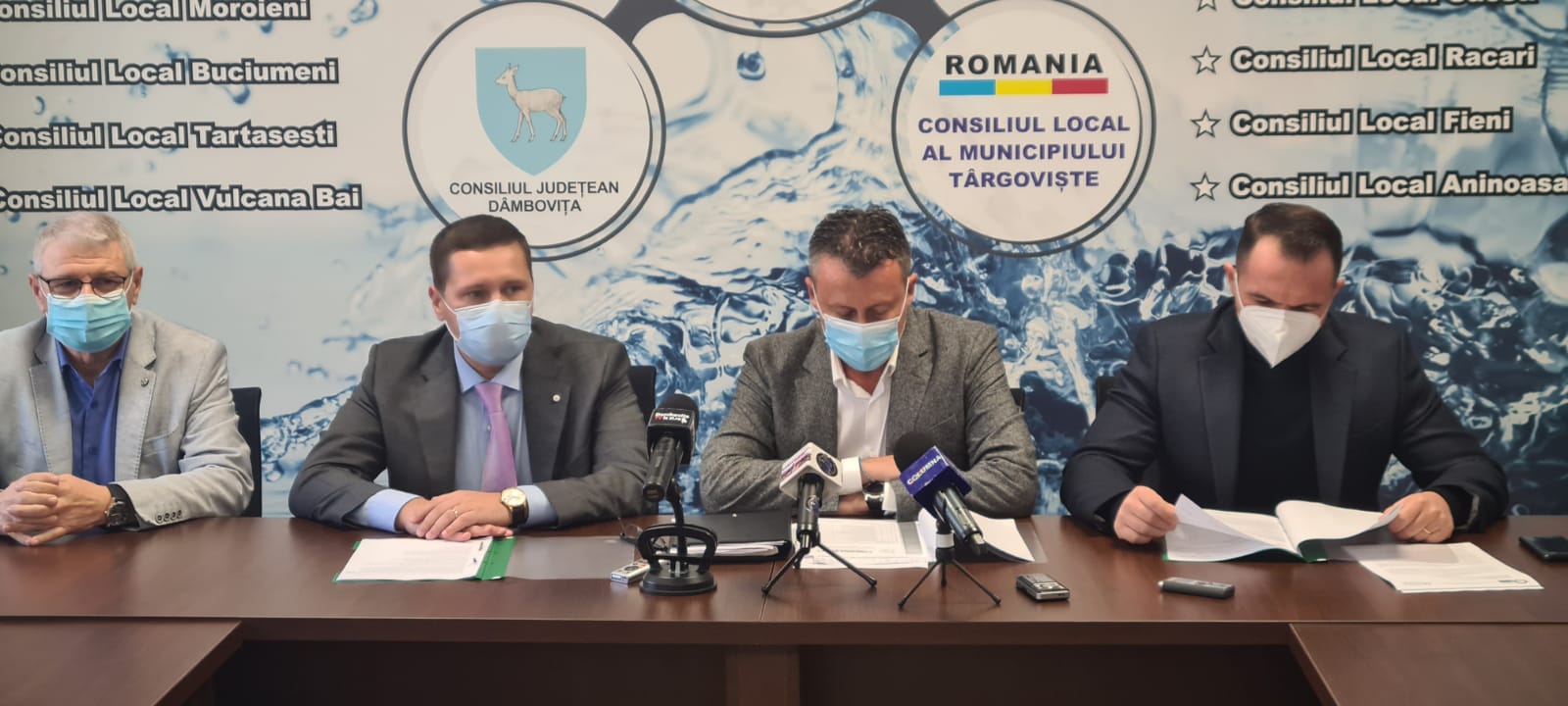 Președintele Consiliului Județean Dâmbovița (CJD), Corneliu Ștefan, a participat astăzi, 8 noiembrie 2021, alături de primarul municipiului Târgoviște, Cristian Daniel Stan, la conferința de presă găzduită de managerul Companiei de Apă Târgoviște Dâmbovița, Adrian Dumitru, cu prilejul semnării contractului de furnizare „DB-CF-02-Furnizare utilaje si echipamente operationale” – Lot 2: 42900000-5 – Diverse utilaje de uz general şi special, din cadrul „Proiectului Regional de dezvoltare a Infrastructurii de apă și apă uzată din judeţul Dâmbovița, în perioada 2014-2020”, în valoare de 124.000.000 lei.
