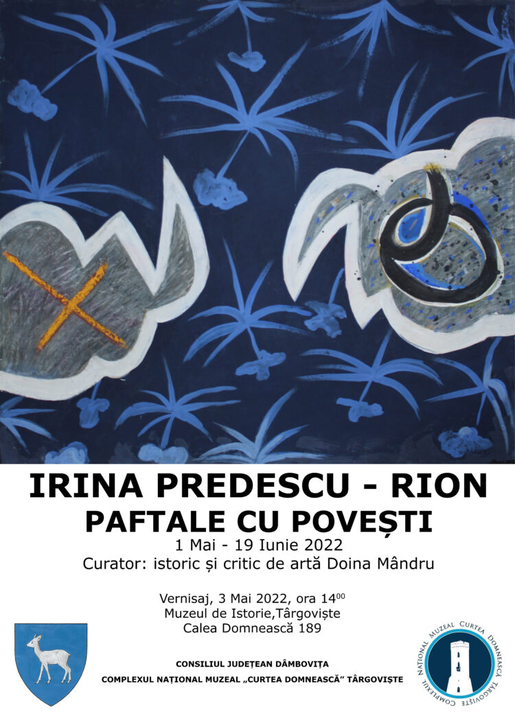 Consiliul Județean Dâmbovița, prin Complexul Național Muzeal „Curtea Domnească” Târgoviște, vă invită să vizitați, începând cu data de 1 mai 2022, expoziţia de pictură „Paftale cu povești” a Irinei Predescu-Rion, artist-restaurator, care va fi deschisă la Muzeul de Istorie din Târgovişte, Sala Auditorium.