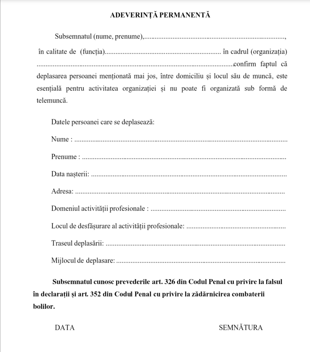 Trebuie să știți că pentru fiecare astfel de deplasare va trebui să aveți asupra dumneavoastră o declarație pe proprie răspundere, însoțită de actul de identitate, iar dacă este vorba despre locul de muncă, și de o adeverință de la angajator