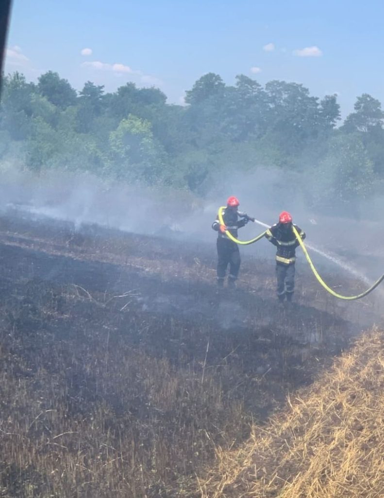 Pompierii dâmboviţeni intervin în acest moment pentru stingerea unui incendiu izbucnit la o cultură de orz din orașul Răcari, sat Ghergani.