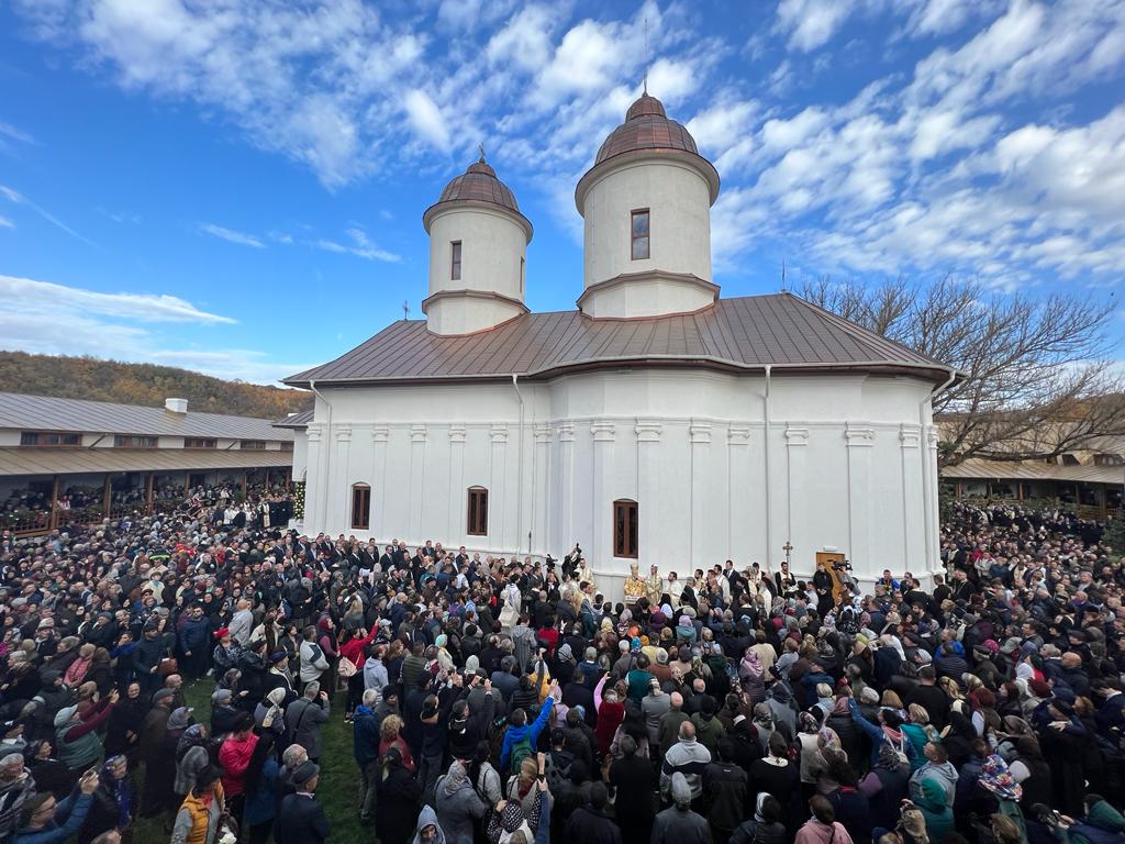 Slujba de resfințire a bisericii, cu hramurile Nașterea Maicii Domnului și Sf. Mare Mucenic Gheorghe, precum și Sfânta Liturghie au fost oficiate de către Înaltpreasfinția Sa, însoțit de un sobor de preoți și de diaconi. Apoi, a fost sfințită trapeza complexului monahal, după ce au avut loc ample și necesare lucrări de modernizare.